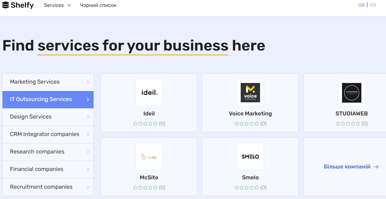 If your company falls into one of the categories and you want to get a new lead generation channel, submit an application on the website. Shelfy will add your agency or product to the catalog for free. Business representatives can quickly make a decision to switch to a new and convenient solution for the development or organization of business processes.